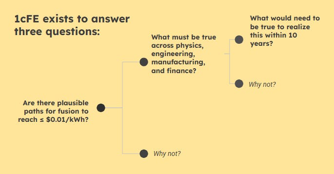 For companies interested in targeting 1¢/kWh, 1cFE’s work will help identify a path forward. The goal is not to prove out or favor any particular confinement system or fuel choice; it is to slash uncertainty so that technologists and investors pursuing ultra low cost fusion can direct resources into the ideas most likely to radically change humanity.