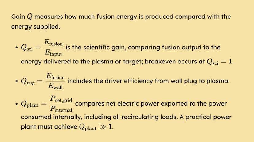 Two feasibility metrics are particularly important when comparing technologies at the experimental stage: the triple product and the gain. Triple product represents the threshold plasma density, temperature, and confinement time required for a technology to trigger fusion Gain measures how much more energy a technology creates with fusion compared to the amount of energy it needs to start and sustain it. Small-scale experiments at Lawrence Livermore National Lab have yielded greater energy (8.6 MJ) than that delivered by a laser (2.08 MJ). This represents a theoretical, “scientific gain,” as opposed to the engineering gain or “plant gain,” for a whole facility. The inefficiency of the Livermore Lab laser makes it so that the system still uses much more energy than it generates.