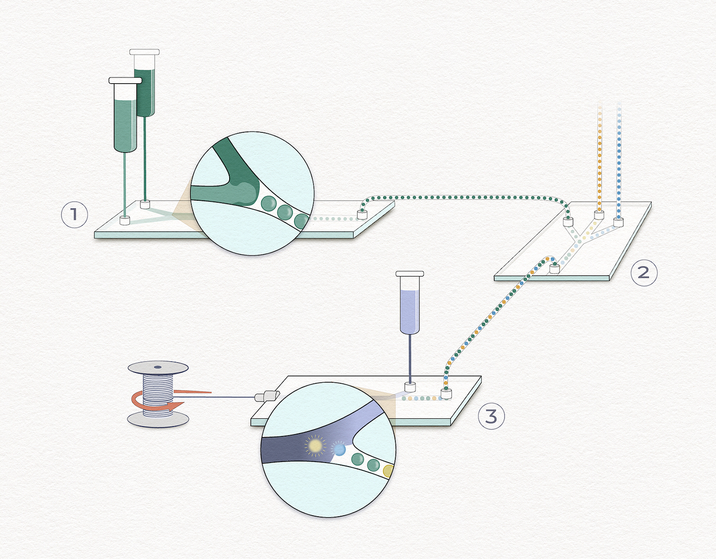 The team is prototyping a three-part platform. First, a microfluidic device encapsulates small droplets of dissolved proteins, transforming them into stable droplets. The droplets can then be arranged, sorted, manipulated and programmed into desired arrangements, like beads on a string that program how the material is assembled. A third device then bursts the droplets and precisely assembled fibers from its proteins.