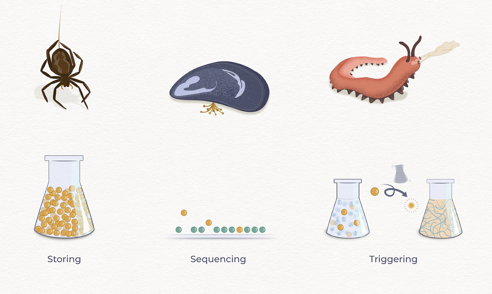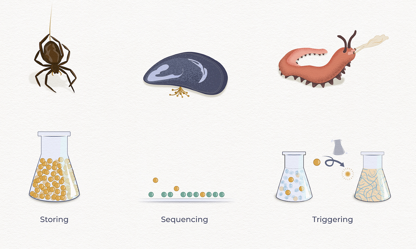 Impossible Fibers’ proposed system begins with “encapsulation,” inspired by how creatures like spiders, mussels, and velvet worms store, sequence, and trigger protein assembly.